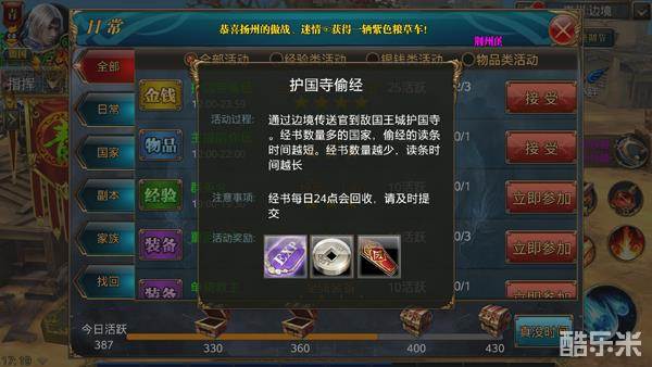 1.玩家可以通过主界面的日常—国家,找到偷经书任务点击接取。