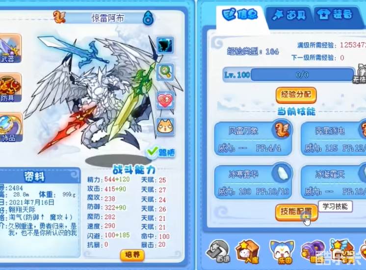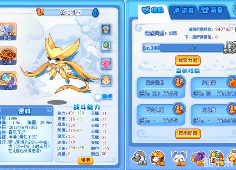 进阶技能有画龙点睛、时间咆哮、圣龙狂斩,画龙点睛使用后可全面提升阿布的各项能力,包括攻击、防御、魔攻、魔抗和速度等,在面对实力强劲的BOSS或者属性克制自己的对手时,先使用画龙点睛强化自身属性,再进行攻击,能大大提高获胜几率,时间咆哮是强力龙系魔法技能,威力巨大,不过使用后下回合阿布无法行动,所以使用这个技能需要把握时机,比如在确定能一击击败对手,或者己方其他宠物能在阿布无法行动的回合承担起防御和攻击任务时,果断使用时间咆哮给予对手致命一击。