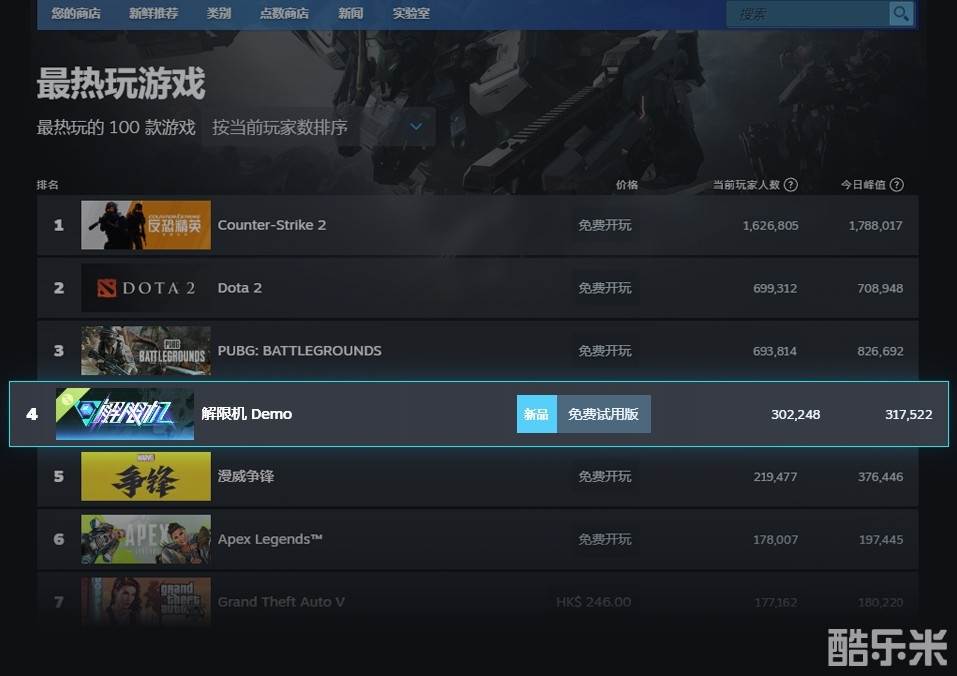 《解限机》于2月23日18时开启本次测试,随即在线人数直线飙升,连续超过《Apex英雄》《永劫无间》《漫威争锋》等在线热门游戏,一举达到317522人,上线仅仅6个小时便成为当日在线人数第4多的游戏。