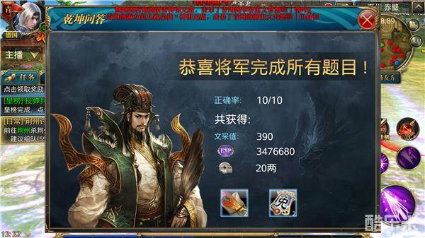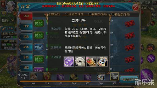 在答题期间玩家会收到【乾坤问答】任务的弹框提示,点击确定即可参与,也可以通过主界面日常——日常——乾坤问答参与答题,答完10道题即可完成任务;