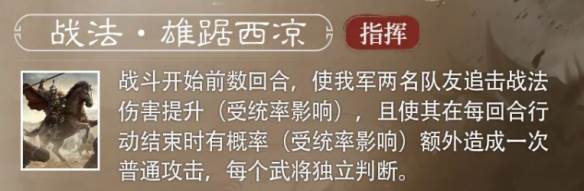 马腾起于微末,应召入伍,累建军功,拥兵割据,凭借自己的军事实力与威望,成功控制了凉州地区,成为一方军阀,为此我们设计了战法“雄踞西凉”,效果为提升追击战法伤害,且有概率追加额外伤害,以突出他在凉州地区的统治地位和影响力。