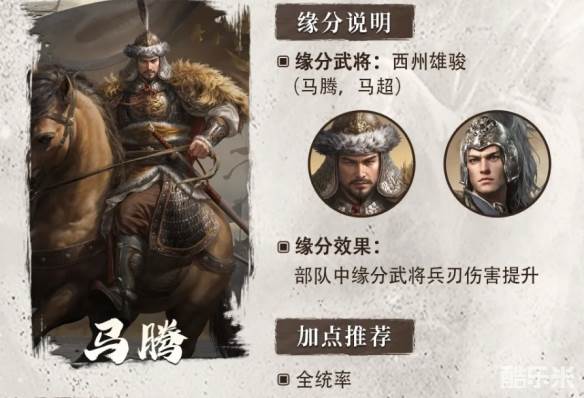 所谓“虎父无犬子,上阵父子兵”马腾之子马超亦是三国时期一员猛将,我们通过建立缘分“西州雄骏”,提升缘分武将的兵刃伤害,来体现他们在骑兵这一兵种上的优秀指挥才能。