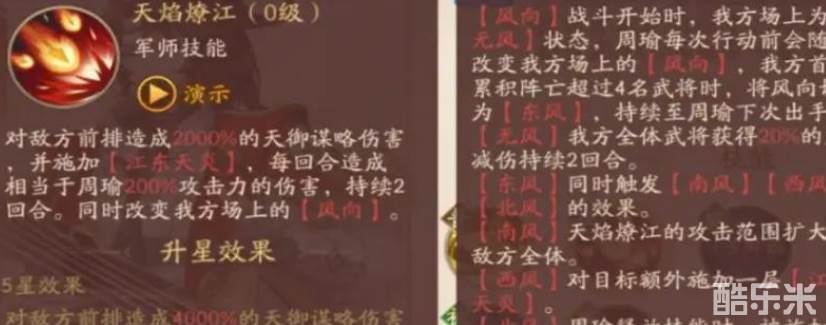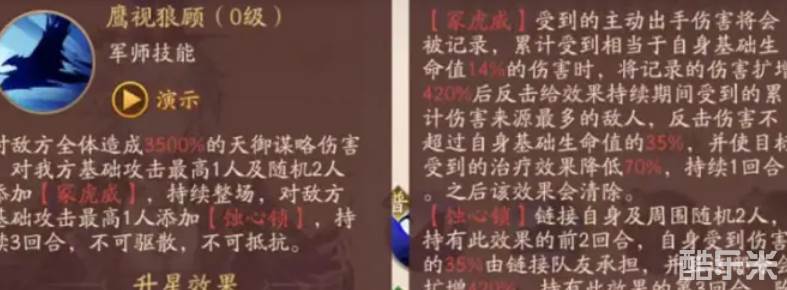 司马懿是资质为三十三点的天金武将,主要的军师技能是鹰视狼顾,在五星情况下可对敌人造成百分之五千的天御伤害。并对我方基础攻击值最高的一个武将与随机的两个队友,添加上家虎威状态,持续时间为整场。这三个人受到伤害都会被记录下来,当累计受到基础生命值百分之二十攻击时,就会将伤害扩增至百分之六百,反击到效果持续期间给予队友累计伤害最高的敌人身上。下面和酷乐米小编一起来看看吧