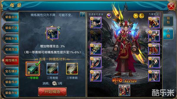 2.属性精炼材料分为:青铜(用于攻击装备上)和铁锭(用于防御装备上);