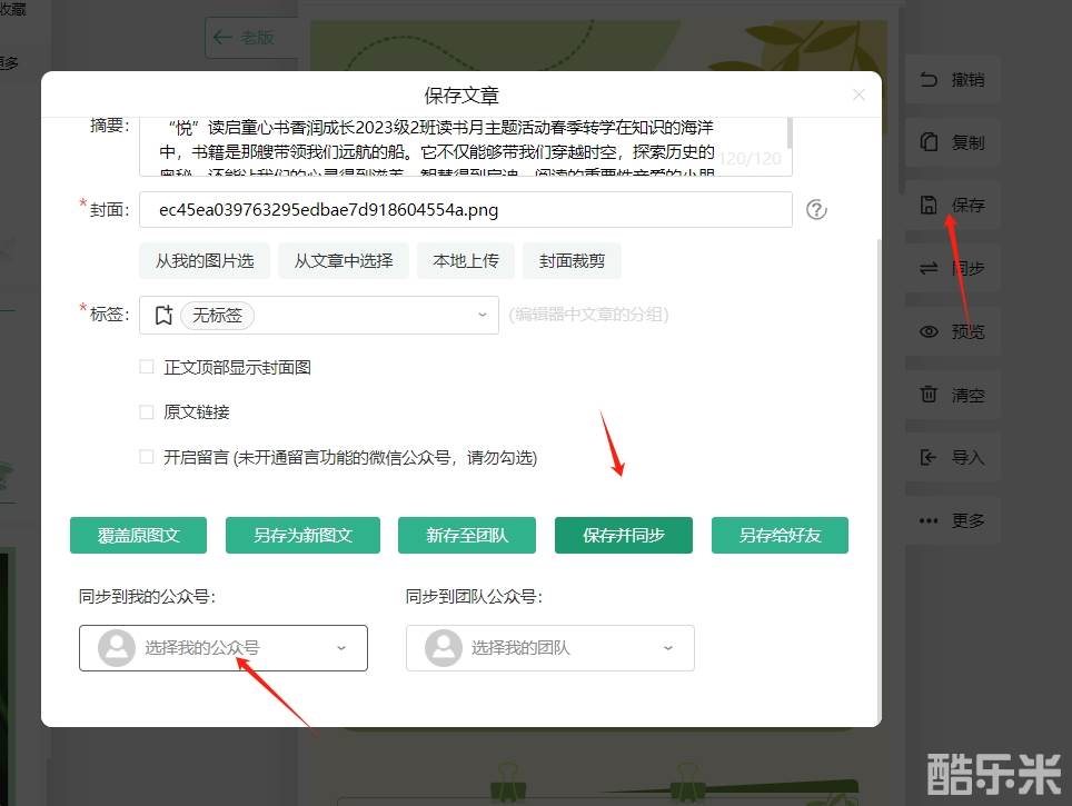 在编辑完成后,点击编辑区右侧的“保存 - 保存并同步”,然后在弹出的窗口中选择要同步的微信公众号。