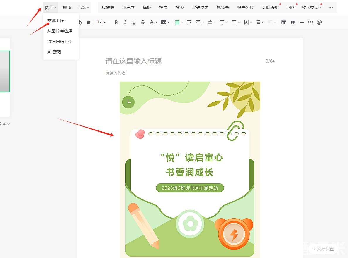 导出完成后,登录微信公众号后台,新建一个图文消息,并点击顶部菜单栏中的“图片”选项,然后选择“本地上传”,将之前导出的图片上传至公众号。