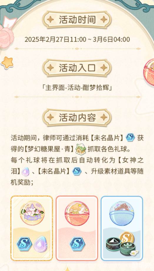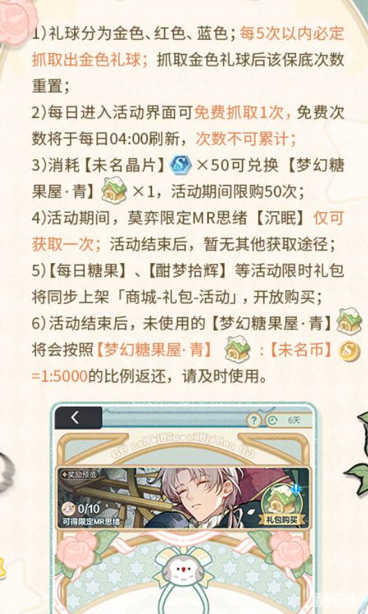玩家们可以消耗50个未名晶片兑换一个梦幻糖果屋,在活动期间一共可以兑换50次。小球一共分为金、红、蓝三个颜色,在抓上来之后会自动转换成女神之泪和未名晶片,以及一些其他的升级道具。玩家们每抓取5次则必定会获得一个金色的小球,当你收集满10个金色小球之后则可以兑换莫弈的MR卡牌思绪【沉眠】。