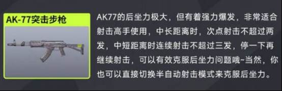 AK-77突击步枪拥有着较强的爆发力。但是对于适合的人群来说要求比较高,新手小白无法正确操控,玩家要拥有高超的射击技术才能轻松使用,最主要在发射的过程中不能连续超过两发,否则会影响射击的目标也可能会惊动敌人。