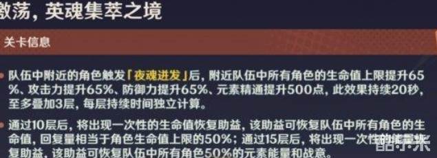 角色触发夜魂迸发后。所有角色生命值上限、攻击力、防御力提升65%,精通提高500