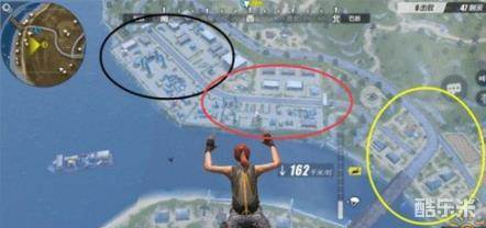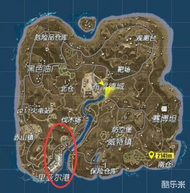 里亚尔港有着全图最特色的防护网带,如图标识,整个红区边缘被钢丝网覆盖,一旦你跳伞失败,落入海中,你需要绕行到居民区,或是绿框区,才能从这一测进入里亚尔港。这个防护网是能够隔离枪弹的,面对面看到也无法将对方射淘汰,这一特色一点要谨记,灵活运用能够克敌制胜!