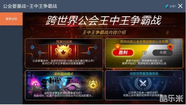 冒险岛枫之传说是一款十分火爆的手游,其中冒险岛枫之传说王中王争霸战需要玩家参与公会要塞战赢得比赛,还有很多小伙伴不知道冒险岛枫之传说王中王争霸战怎么玩,下面酷乐米小编为大家介绍一下具体的玩法,希望对感兴趣的玩家有所帮助,大家一起看一看吧。