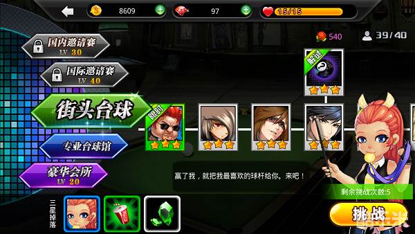 五个会场的难度,逐级提升。后一个会场开启,需要你在前一个会场中打通全部的关卡,并且人物等级达到指定的等级。比如,想要进入“专业台球馆”,需要先打通“街头台球”场中的所有关卡,且人物等级达到10级