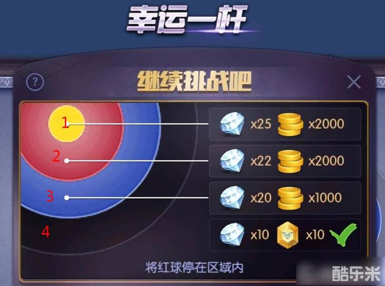 1、玩家需要将红球停在1.2.3.4这4个区域内才算幸运一杆;
