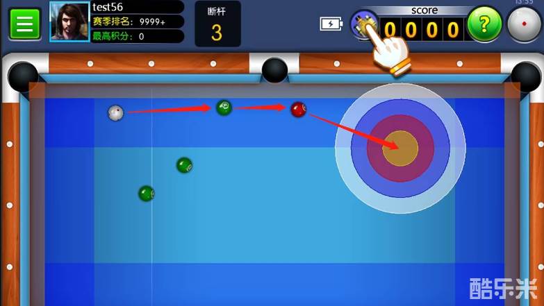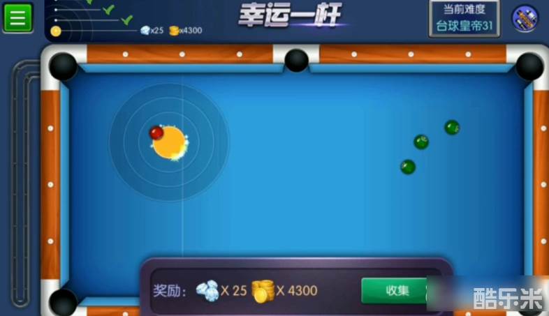 在台球帝国这款游戏中,有一项被称为“幸运一杆”的技巧。这一技巧要求玩家在击打绿色的球时,使用低杆(即红色击球点位于最下方),并全力出杆。当击中绿球后,上方的两颗红球会进入上方的两个底袋,而白色母球则会退回,同时将下方的红球撞进中袋。下面和酷乐米小编一起来看看吧