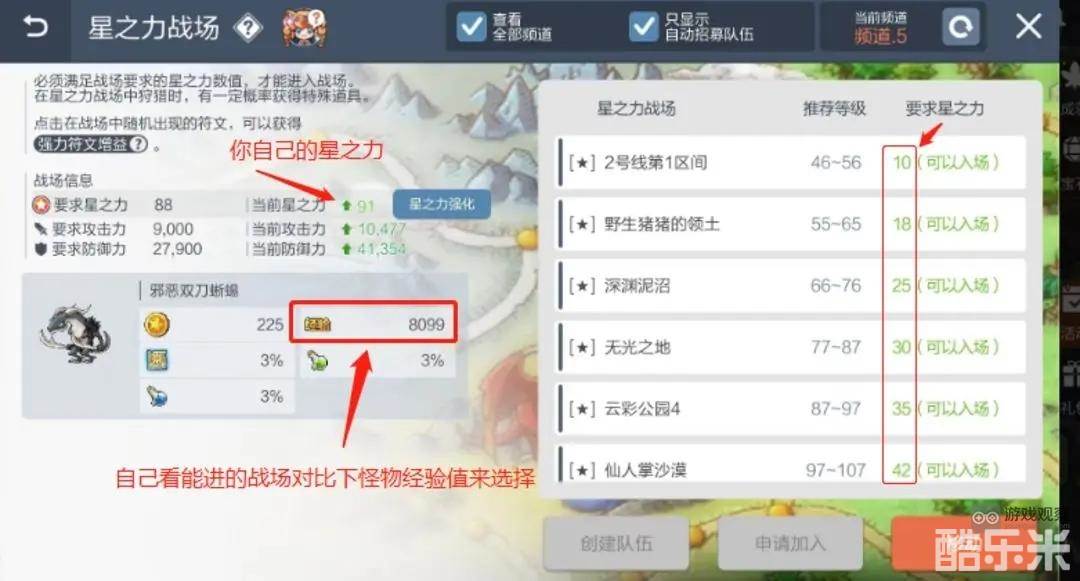 1、星之力战场挂机的前提是你得找到适合自己且保证自己生命值安全的前提下的战场!