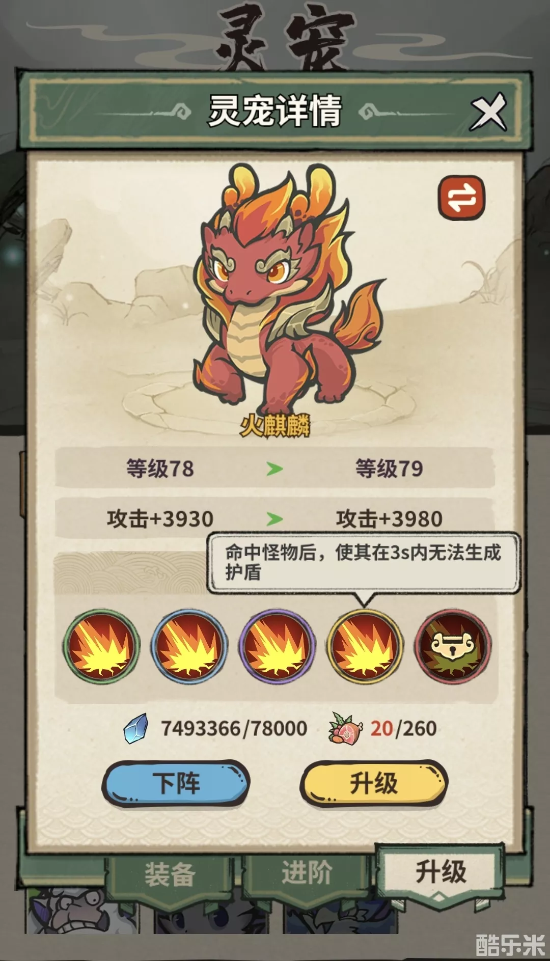 灵宠最重要的就是火麒麟,这个是不论玩哪个系都需要搞的。火麒麟一开始是紫色,需要给它升星至橙色,橙色能解锁一个核心技能“使被命中的怪物3秒内无法生成护盾”避免被一些护盾怪恶心。