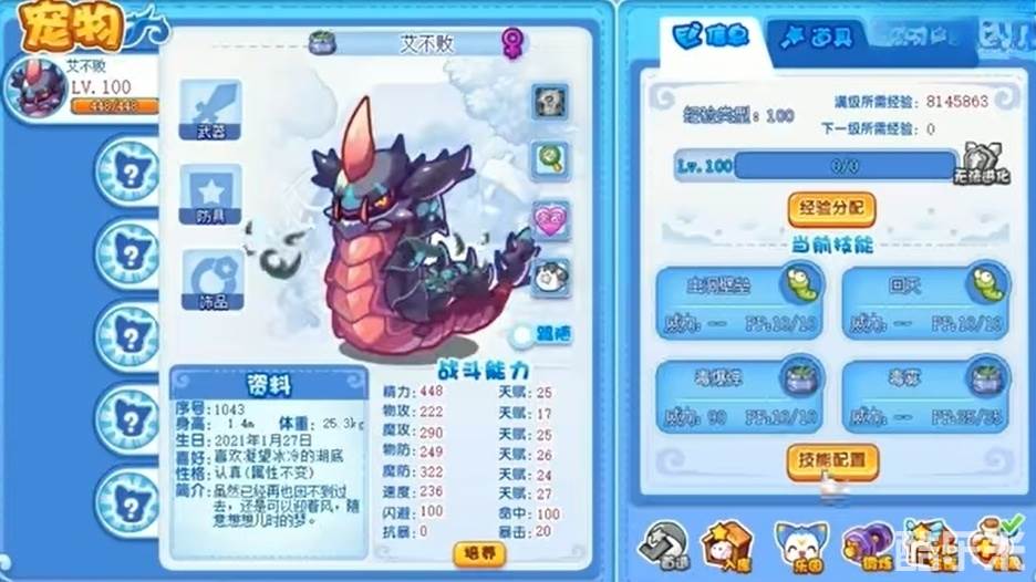 艾不败是一只属性为毒的宠物,身高1.4米,体重25.3公斤,可以通过超进化为艾不灭,进一步提升战斗力。艾不败拥有多种技能,如叶飞针、回天、溶解等,不仅能够对敌人造成持续的毒性伤害,还能在关键时刻控制战场局势,使得艾不败在战斗中表现出色。