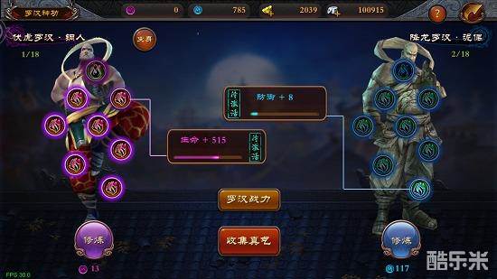 罗汉神功中包含18位罗汉铜人和18位罗汉泥偶,角色通过收集真气得到蓝色真气和紫色真气,蓝色真气可用于修炼18位罗汉泥偶,紫色真气可用于修炼18位罗汉铜人。罗汉泥偶和罗汉铜人修炼后均可提升角色战力,激活罗汉泥偶后能够解锁对应的罗汉铜人,每激活一个罗汉铜人即可解锁一个高级变身。