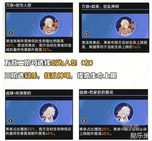 3、万敌:二阶可选择剑为人怨(左)、三阶选弑杀,狂乱神明,提高生命上限。