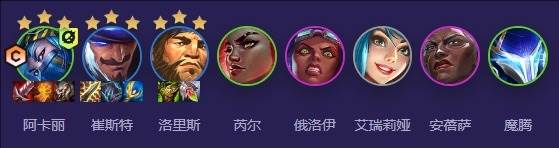 如果先做的阿卡丽装备,那么就3-2升6搜卡,追三星卡丽(最晚4-2出)后上7追卡牌、洛里斯/芮尔二选一,而后上8补完整羁绊。