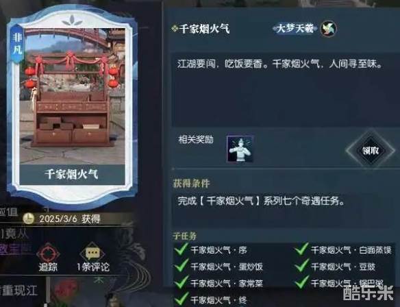 千家烟火气为逆水寒大梦天羲版本新增的奇遇,那么该奇遇怎么完成呢,奇遇共分为7个小奇遇,只需去对应的地方找对应的人对话,按照顺序做完即可完成奇遇并获得说英雄卡【千家烟火气】。接下来酷乐米小编给大家带来了详细的《逆水寒手游》千家烟火气奇遇攻略!