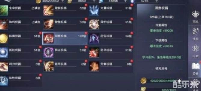 按照【锋利】、【洞察】、【力量】、【利刃】、【生命】、【防御】和【元素祝福】顺序升级。可加强基础攻击力、暴击强度、重击强度、真实攻击、全属性强化等属性,进一步强化输出能力,也可适当升级【敏捷】、【敏锐】,增加容错率。