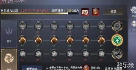 军衔战技第一排技能可增加命中、真实攻击、格挡,这些属性对输出能力增益并不高;第二排提升全属性强化、爆伤强度,而且节点技能也可增加暴击,性价比较高,因此优先点满第二排;第三排技能主要双防解除、重击和闪避,有一定的效果,建议在升级第二排获得关键节点技能后,可适当升级第三排。
