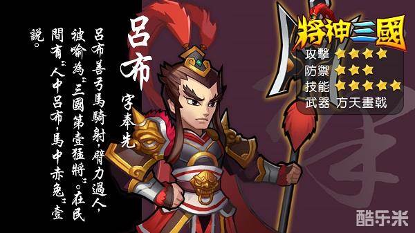 群雄战神,强力输出,手持”方天画戟“,其大招”独霸天下“短时间内多次攻击敌人,造成大量伤害,60开启“武神”技能,大幅提高自身攻击力!