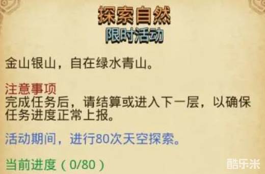 活动期间,玩家需进行80次天空探险即可完成任务领取奖励。