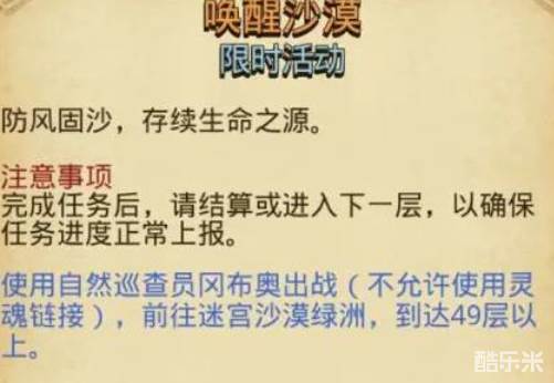 需要各位冒险者使用自然巡查员冈布奥,前往迷宫沙漠绿洲,并达到49层以上即可获得任务奖励。