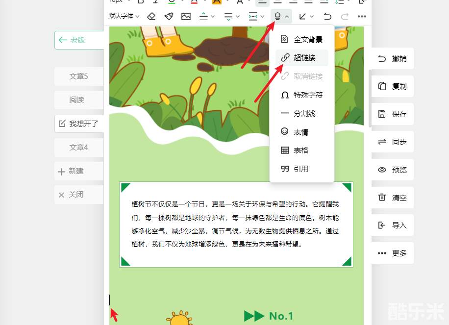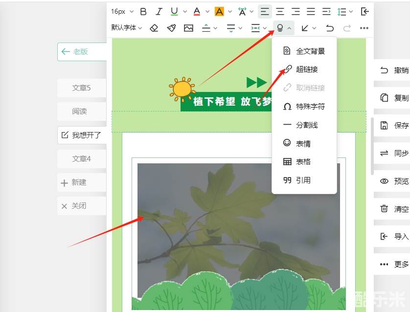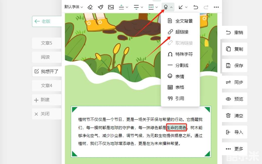 首先,在您的文章中定位到希望添加超链接的位置。接着,点击编辑器上方的“小功能-超链接”。