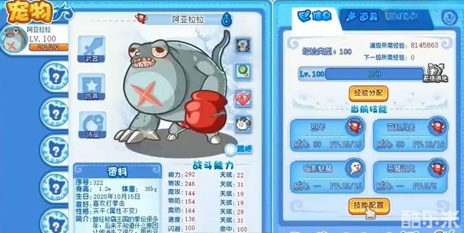 拳魔阿亚拥有武系技能,在对抗恶魔系宠物时具有天然的优势,血量低于一半时,拳魔阿亚会自动获得300点护盾,这大大增强了它的生存能力。此外,还拥有多种防控和回复技能,使得它在持久战中能够保持较高的战斗力。