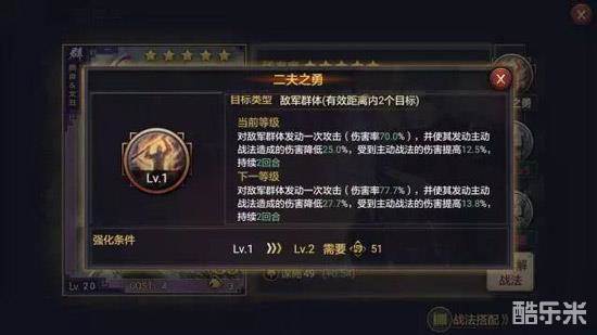 说完面板我们来看看战法。颜良文丑的自带战法是一个主动性伤害战法,距离4,效果是对敌方群体造成一次140%伤害率的伤害,并使其发动的主动战法伤害率降低50%,收到的主动战法伤害率提高25%。但在能同时触发两个效果之后他的作用就大大增强了,不仅能减少非菜刀队的敌方输出,还能提高我方的输出能力,虽然增益是固定的25%,但这个增益很难和其它技能产生冲突。并且作为一个不需要准备回合的技能来说,二夫的伤害率基本等同于临危,还不用付出代价。一个强化版的四星战法再附带两个特效,这个五星技能性价比可以说相当之高。
