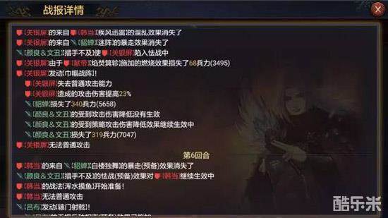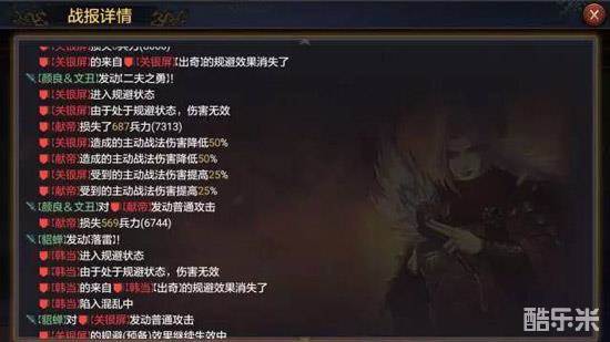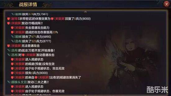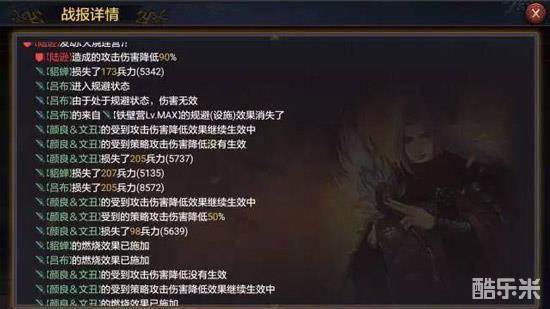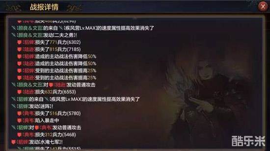 虽然伤害增益的效果没有面板上25%那么美好,不过那50%的伤害减少Debuff还是很实在的。这是来自另一份战报的数据,可以看到在没有被二夫打中之前关妹打出的数字分别是671和523。而在受到影响之后关银屏打在貂蝉身上的数字变成了340,虽然有一部分兵力减损的原因,不过这个减伤效果还是很实在的。