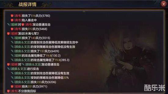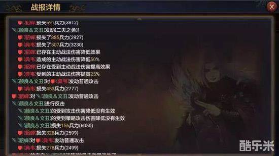 而同时颜良文丑的减伤效果也十分显著,他的减伤可以和群貂蝉的指挥战法完美叠加,可以看到在双重减伤的保护下,即使是颜文、吕布这样的弱智将领在面对对方的法系输出时受损也明显降低,不痛不痒。