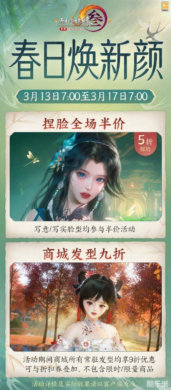 剑网3捏脸半价活动春日焕新颜将于3月13日上线,那么本次活动有什么内容呢,活动期间写意与写实脸型均享5折折扣并且商城内的所有常驻发型都享9折折扣。除此之外还有新一期积分兑换和充消赠礼活动会一并上线。接下来酷乐米小编给大家带来了详细的《剑网3》春日焕新颜捏脸半价活动介绍!