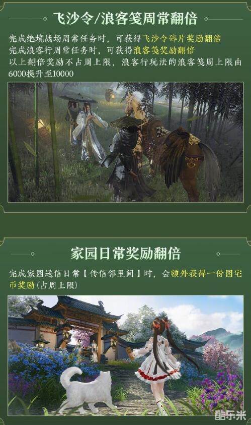 飞沙令碎片、浪客笺奖励翻倍,浪客行周上限变为10000.