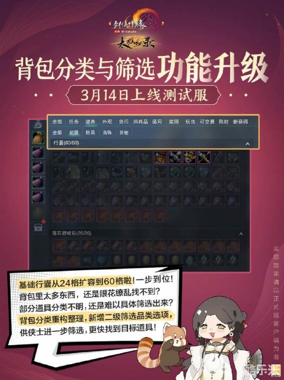 背包从24格变为60格,并且对分类功能重构,新增二级筛选品类。