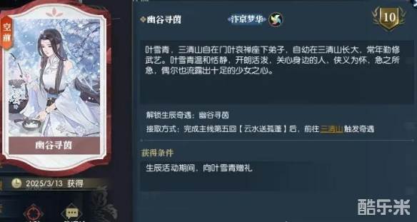 幽谷寻茵是逆水寒角色叶雪青的生辰奇遇,那么该奇遇要怎么完成呢,给【叶雪青】送礼可触发该奇遇然后去去三清山(390.683)接取任务,先修剪树干再采花,最后对话师姐去放花灯,完成后结束奇遇。接下来酷乐米小编给大家带来了详细的《逆水寒手游》幽谷寻茵奇遇攻略!