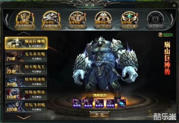每当达到一定等级时,便可挑战一个boss,等级越高可挑战的boss种类越多,挑战boss可获取大量装备材料。