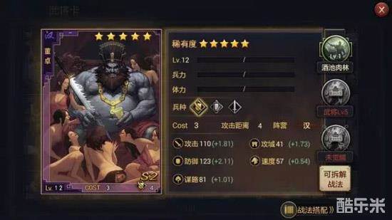 首先我们来看一下汉董卓的成长,攻击成长1.81,不属于输出武将行列,不过作为一名坦克武将还算可以。防御成长2.11,前排扛刀没有问题。最薄弱的谋略方面也有1.01,算是脱出了弱智武将的行列。速度就不说了,步兵的速度都一样。综合来说汉董卓的属性中规中矩。