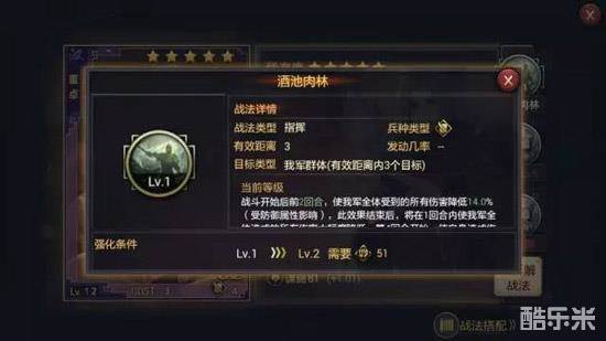 然后我们来看看他的战法,满级属性为战斗开始后前2回合使我军全体受伤降低28%,第三回合使我方所有伤害降低90%,第四回合起自身造成伤害时获得35%攻心效果。这是一个效果非常复杂的战法,不过并不难理解,我们分条来看。第一条是毫无疑问的强势效果,两回合的全体减伤,就个人感觉来说比避其锋芒3回合的群体减伤要好不少,而且是防御属性加成,并没有谋略需求,不用加不必要的点。第二条是这个战法的负面效果,所有人减伤90%一回合还是挺伤的,尤其是还放在比较重要的前三回合,不过考虑到第一条效果的优越性来说也不是不能接受,而且减伤90%的话当回合还是能打出少量输出。第三条和群董卓一样35%攻心效果,配合一些群伤战法能有效回复兵力。那么如此多而杂的效果在实战中如何,第三回合的负面Buff又如何避免,我们以实战为例讲解。