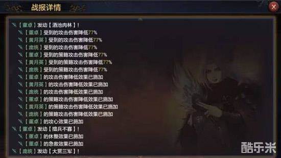 董卓的攻心效果虽然不强但也聊胜于无,配合回马每回合能反出1000左右的伤害恢复300左右的兵力,再加上擅兵不寡的回复,一场战斗总回复率可以达到6000-8000,基本上是多了一条命。而和汉董配合最好的是刘备,高额的减伤加上刘备的恢复力,使得队伍在前两回合基本处于无伤状态。而后期又可以借重整旗鼓之类的战法加大恢复量,奶出一片天。
