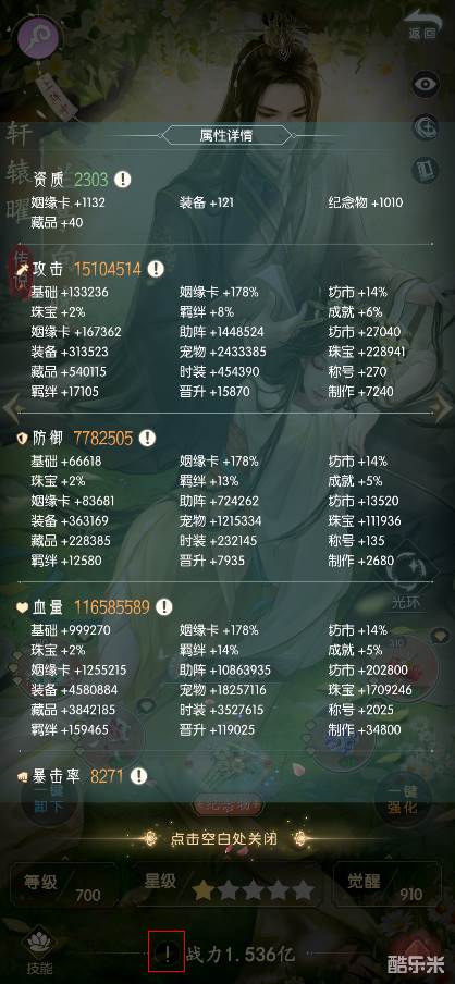 点击战力旁的感叹号可以查看属性详情,查看各项属性的来源。