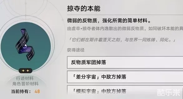 崩坏星穹铁道掠夺的本能是什么,掠夺的本能是一种角色养成材料,由虚卒掠夺者体内逸散出的微弱反物质,如同破坏本能的具现化。微弱的反物质,强化所需的简单材料。下面和酷乐米小编一起来看看吧