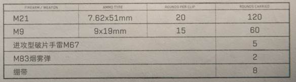 道具可携带5个手雷,2个烟雾弹,8个绑带。