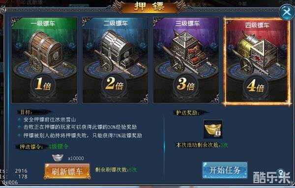 游戏中需要花费绑定元宝,但是钱袋没有怎么办?没关系,《武炼巅峰》中有一种快速致富的方法就是押镖,押镖等级不同可以获得不同数量的绑定元宝。