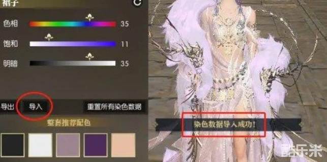 在染色界面中,点击【导入】按钮,将之前复制的染色数据粘贴进去。点击确认后,染色数据会应用到当前选中的时装上。