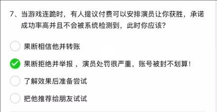 7、当游戏连跪时,有人提议付费可以安排演员让你获胜,承诺成功率高并且不会被系统检测到,此时你应该?
