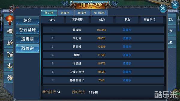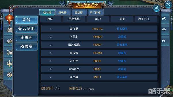 点击界面左边展开按钮,进入主界面,可以看综合排行榜以及苍云圣地、凌霄阁、驭兽宗三个职业的排行榜。